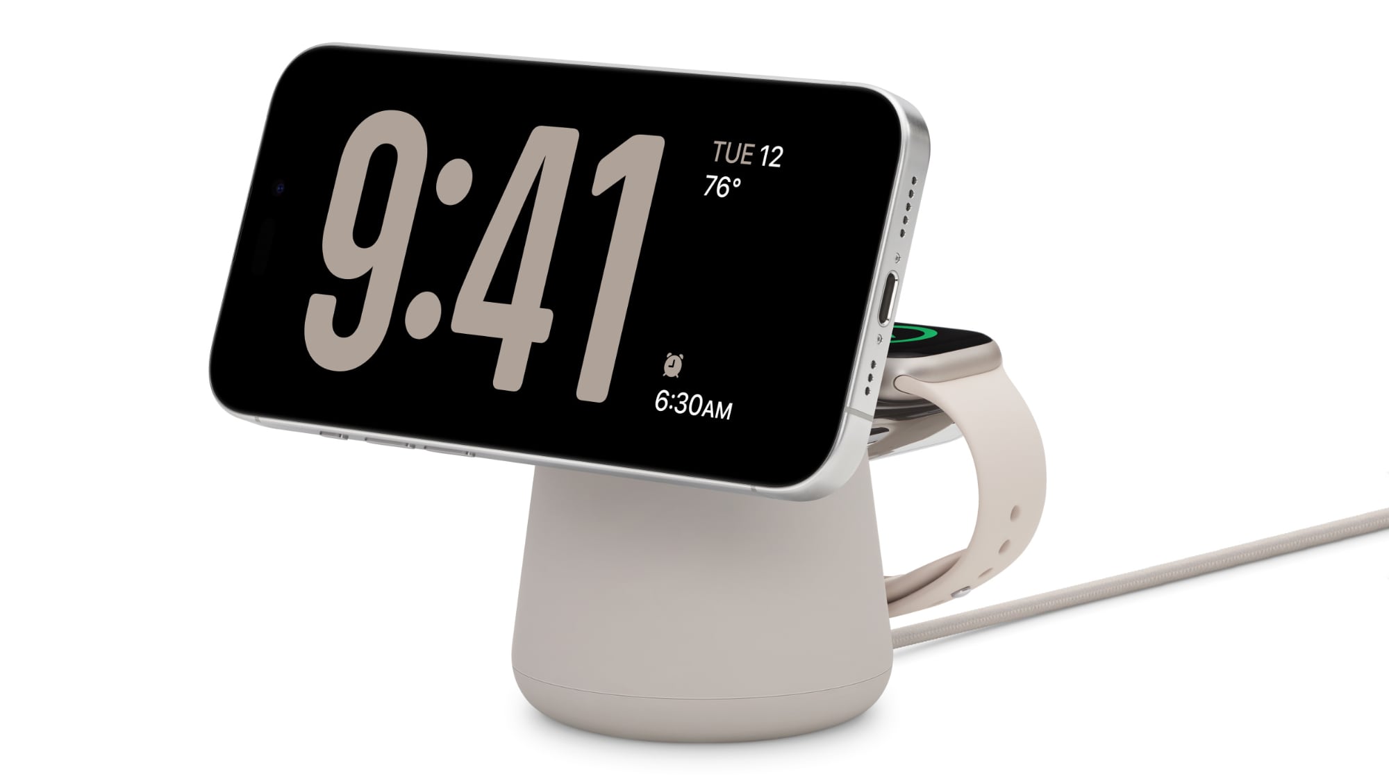 Available in sand or charcoal colors, the BoostCharge Pro 2-in-1 Dock has an adjustable ?iPhone? charging mount that can be set to multiple viewing angles from 0 to 70 degrees. It is able to hold an ?iPhone? at the correct landscape angle for StandBy to work, plus it can be positioned into a flat charger for charging devices like AirPods.