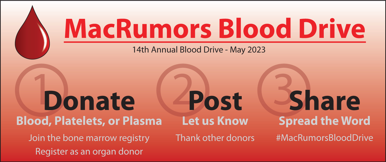 MacRumors is pleased to announce our Fourteenth Annual MacRumors Blood Drive, throughout the month of May 2023. Let’s save lives together by encouraging donations of blood, platelets, and plasma. While most blood drives are specific to a geographic location, our blood drive is online and worldwide. Anyone can participate.